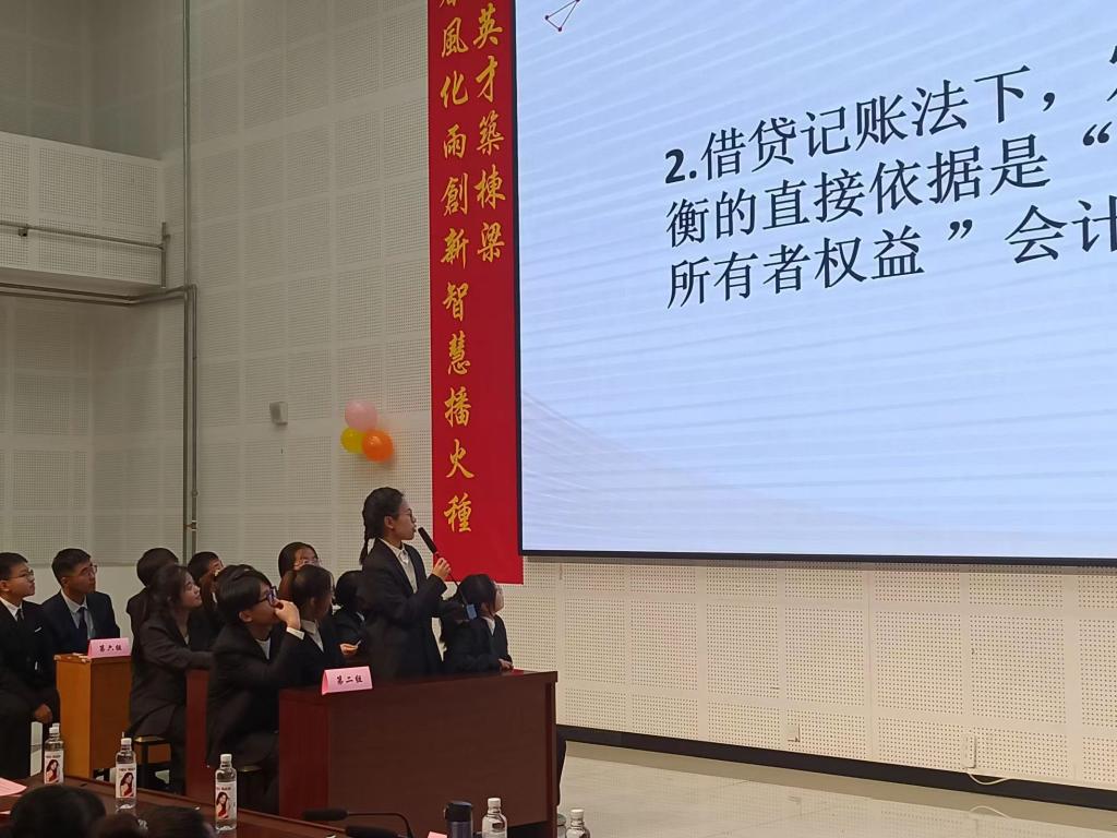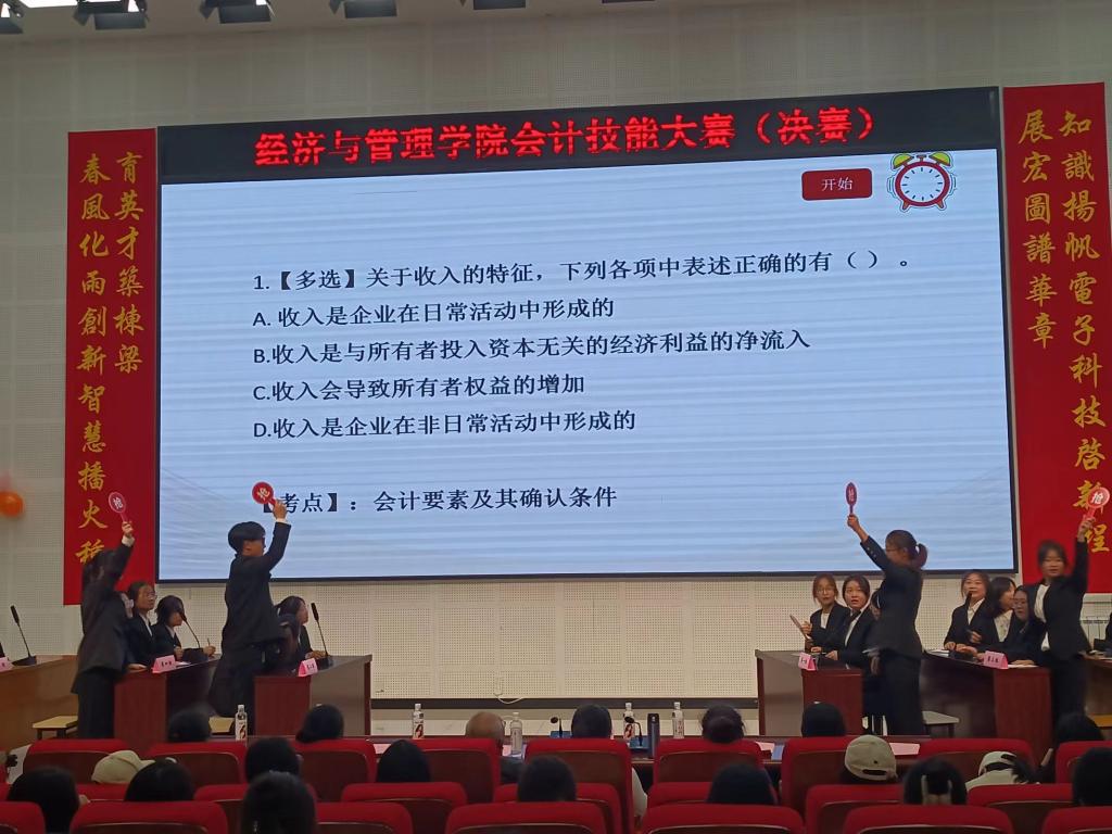 本次比赛通过班级选拔和初赛笔试环节激烈角逐,最终有六支队伍脱颖而出进入决赛现场。决赛开始前,闫献国教授致开幕辞,他强调了会计技能大赛对强化员工会计实操能力的重要性,并预祝本次大赛圆满成功。随后,比赛正式开始,在“小试牛刀”“你借我贷”环节参赛选手认真做答,充分考验了选手对基础会计知识的掌握程度;在“心有灵犀”环节,考核了选手对会计科目、经济法基础知识的熟知度以及各队友间的默契度;在“弹斤估两”环节,选手们积极讨论,体现了较强的团队合作能力;在“运筹